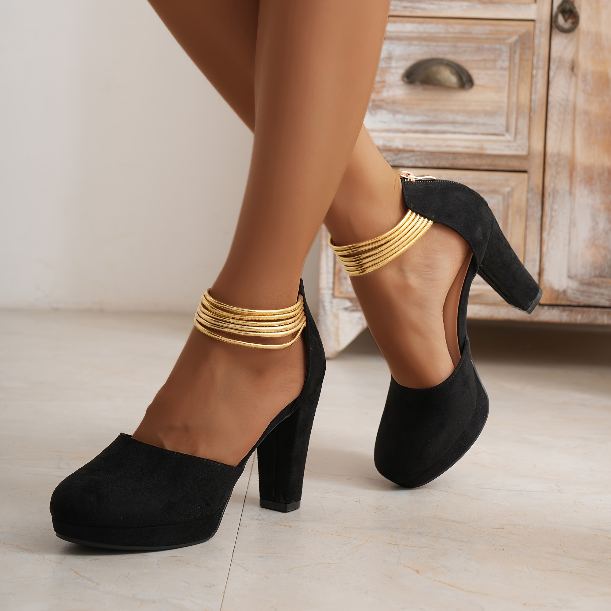 Women's Solid Color Trendy Shoes, Slip On Metallic Ankle Strap Comfy Platform Shoes, Chunky Heel D-Orsay Party Shoes
